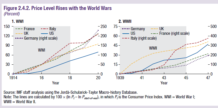 In Austria, Germania, Ungheria e Polonia l’inflazione sfociò in iperinflazione, con conseguenze politiche ancora peggiori. Dopo la seconda guerra l’inflazione raggiunse il 50 per cento negli Usa il 200 per cento il Italia e Francia.