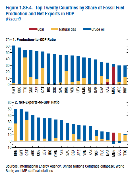 Torniamo al presente, o meglio ancora al passato recente. Fra il 2010 e il 2019 l’importanza relativa dell’estrazione di fonti fossili rispetto al pil è stata molto elevata in paesi come l’Angola, l’Azerbaijan, il Congo, il Kuwait, l’Arabia Saudita.