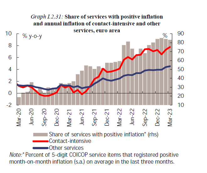 La buona notizia, però, ne porta con sé una brutta: “I beni core – quelli primari potremmo dire – e i servizi hanno rimpiazzato l’energia come driver primari dell’inflazione”, scrivono gli economisti della Ue. Fatto poco confortante perché implica che ormai il contagio si è esteso a tutta la struttura dei prezzi, e questo non giova certo alla formazione di aspettative coerenti con i target di banca centrale.