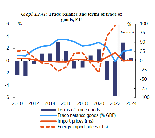 La normalizzazione dei prezzi energetici, che ormai non sono più i driver del processo inflazionistico, agendo sulle ragioni di scambio, ha favorito un notevole recupero degli attivi commerciali europei che si può dire siano usciti da un biennio orribile.