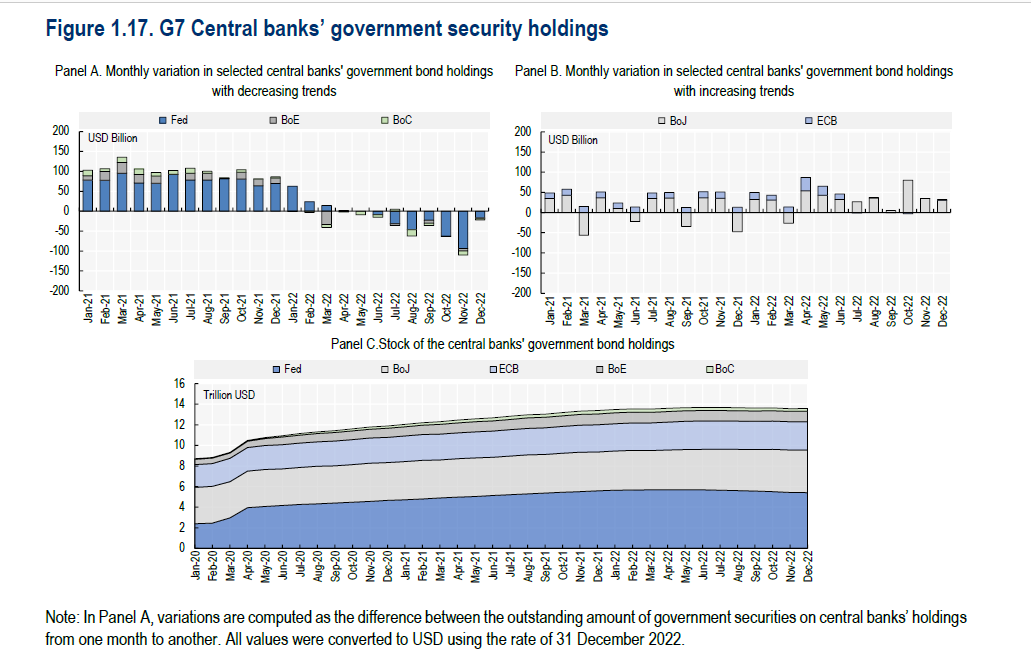 Anzi, riguarda quasi tutti. La Bce, infatti, ancora nella prima metà del 2022 ha incrementato il suo bilancio di 113 miliardi mentre lo ha lasciato stabile nella seconda metà dell’anno. La BoJ, imperterrita, ha aumentato il bilancio di 166 miliardi nella prima metà del ’22 e addirittura di 213 nella seconda metà dell’anno.