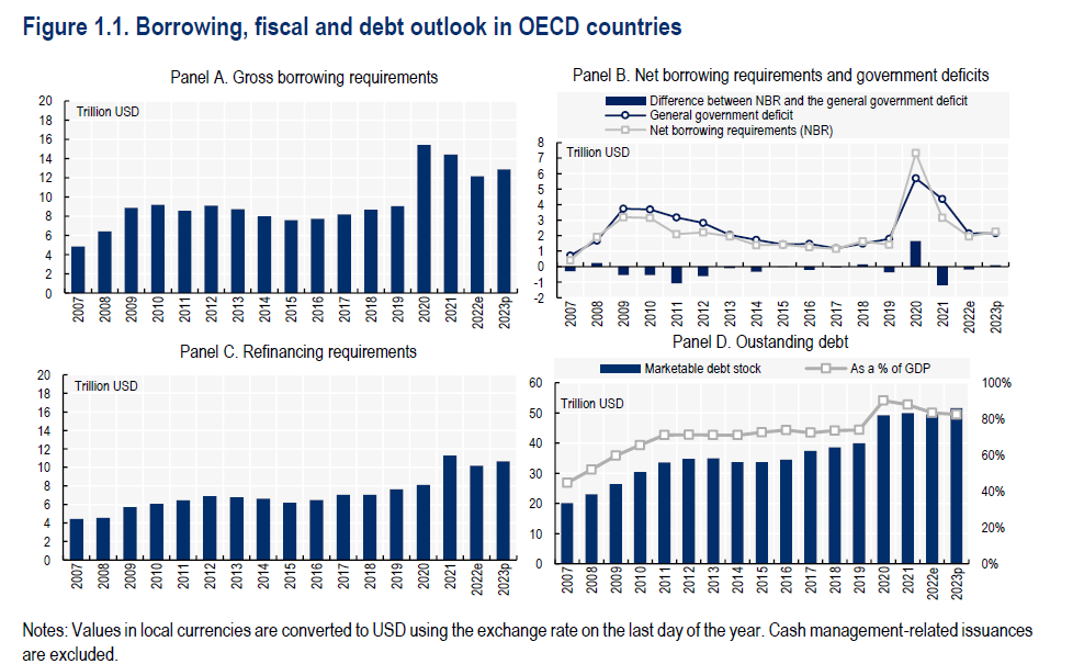 L’ultimo outlook dell’Ocse sul debito sovrano sembra confermi questa tendenza, che si può osservare notando come nel quindicennio trascorso fra il 2007 e il 2023 i fabbisogni di finanziamento dei paesi dell’area siano più che triplicati, passando dai quattro trilioni annui dell’inizio della serie ai quasi tredici della fine.