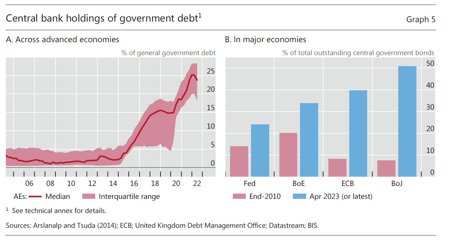 Se oggi ne parliamo è perché il grafico che abbiamo messo in apertura di post ci racconta un’altra storia: ossia che abbiamo un problema. Notate che fino al 2014 le banche centrali tenevano una percentuale di debito del governo inferiore al 5 per cento del flottante. Adesso sfioriamo il 25 per cento, con esempi monstre, tipo il Giappone, che ha superato il 50 e la nostra Bce che supera il 40 per cento.