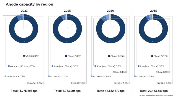 Per dare un’idea, secondo le stime più recenti, gli anodi prodotti in Europa sono circa lo 0,2% del totale nel 2023, a fronte dello 0,5% Usa e del 92,8% cinese. Le proiezioni indicano che la Cina “scenderà” al 90,2% nel 2035, mentre Europa e Usa “saliranno” al 2,2% e 3,9%. Un bel progresso rispetto ai livelli attuali, ma certo ben lontano da quanto sarebbe necessario per sciogliere il nodo gordiano che lega la Cina all’Europa e all’Occidente e che alimenta i nostri sogni di un mondo più fresco e pulito.