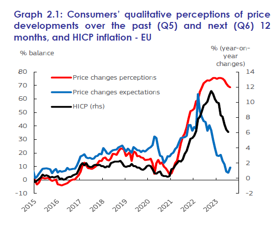 Ed è proprio questo combinato disposto che complica l’analisi. La percezione dei rincari, infatti, è assai più pronunciata di quelli effettivi, e questo ci riporta a un discorso che abbiamo già fatto, ossia di come le aspettative finiscano per “schiacciare” il futuro sul presente.