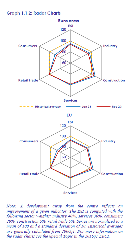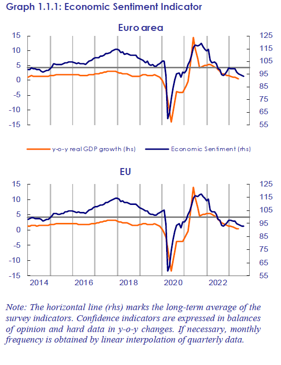Di questo senso di triste declinare ci racconta un recente rapporto diffuso dalla Commissione, l’European Business cycle indicator del terzo quarto del 2023. La curva del sentiment segue quella dell’andamento del pil: declinano insieme insomma, e ormai è scivolata sotto la media di lungo periodo (100 punti), portandosi poco sopra 90. Tristezza, appunto, non depressione come quella osservata nel 2020, quando, complice la pandemia che già era angosciosa di suo, il sentiment sprofondò a 60, salvo poi risalire bruscamente un anno dopo.