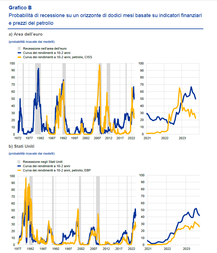 Se aggiungiamo altre variabili al modello, però, il risultato cambia. Inserendo l’andamento (sempre previsto) del prezzo del petrolio, la probabilità di recessione a un anno scende a poco più del 20 per cento nell’Ue mentre negli Usa scende poco sotto il 30.