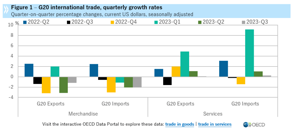 Ce n’è abbastanza, insomma, per osservare con preoccupazione, consci del fatto che stiamo sperimentando una robusta inflazione associata a una forte stretta monetaria e a vari turbamenti internazionali che scoraggiano una delle fonti principali della ricchezza globale: il commercio. Proprio pochi giorni fa Ocse ha rilasciato il dati sul commercio di beni e servizi e non sono per nulla entusiasmanti.