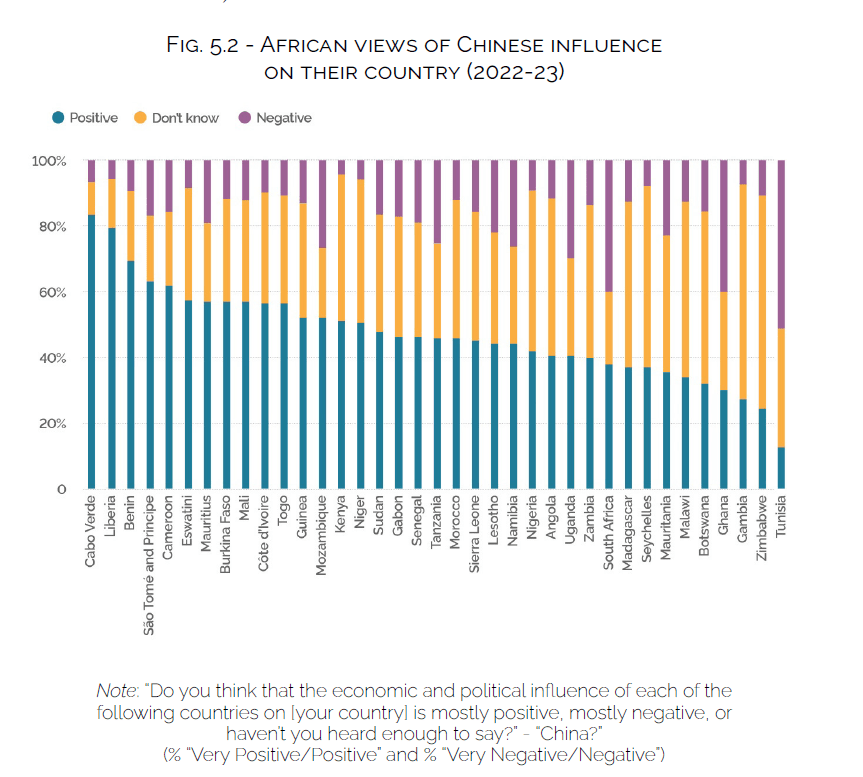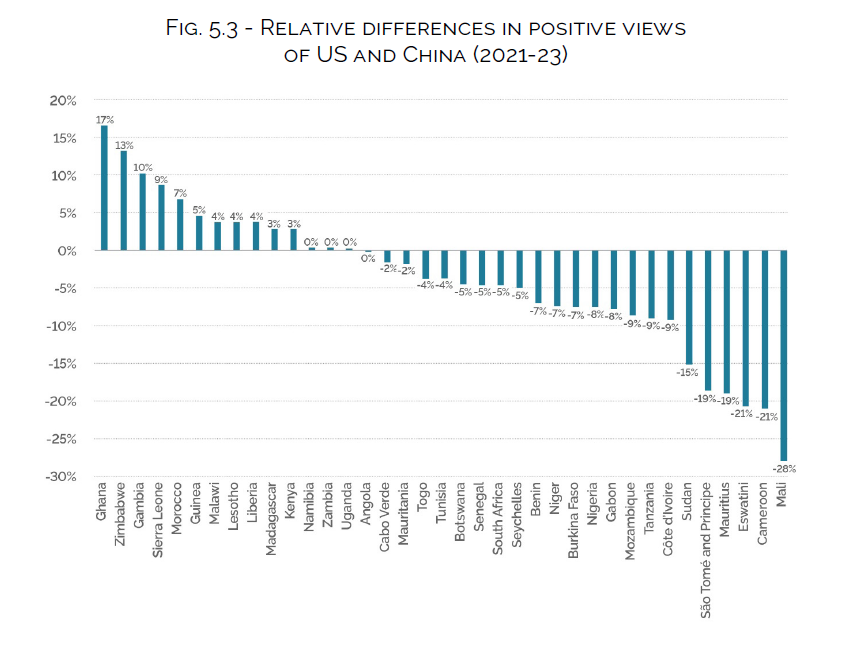 Quindi, per fare un esempio, in Ghana gli Usa hanno un gradimento superiore del 17 per cento rispetto ai cinesi, mentre in Mali in cinesi hanno un gradimento superiore degli Usa di 28 punti.