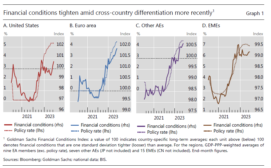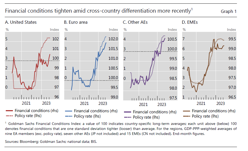 Ciò che si è osservato è che nel corso di questo intenso episodio di restrizione monetaria che, a parte il Giappone e in qualche modo la Cina, non ha risparmiato nessuno, le condizioni finanziarie hanno seguito quasi pedissequamente l’andamento dei tassi di riferimento, specie all’inizio. Addirittura, nelle economie avanzate si è osservato che la reazione dei mercati finanziari ai rialzi sono state più intense di quelle osservate in passati episodi di rialzo dei tassi. E questo ci dà un’idea di quanto fossero “tirate” le condizioni dei mercati finanziari prima. E tuttavia, “il pieno impatto sull’attività reale sembra stia richiedendo più tempo del solito”.