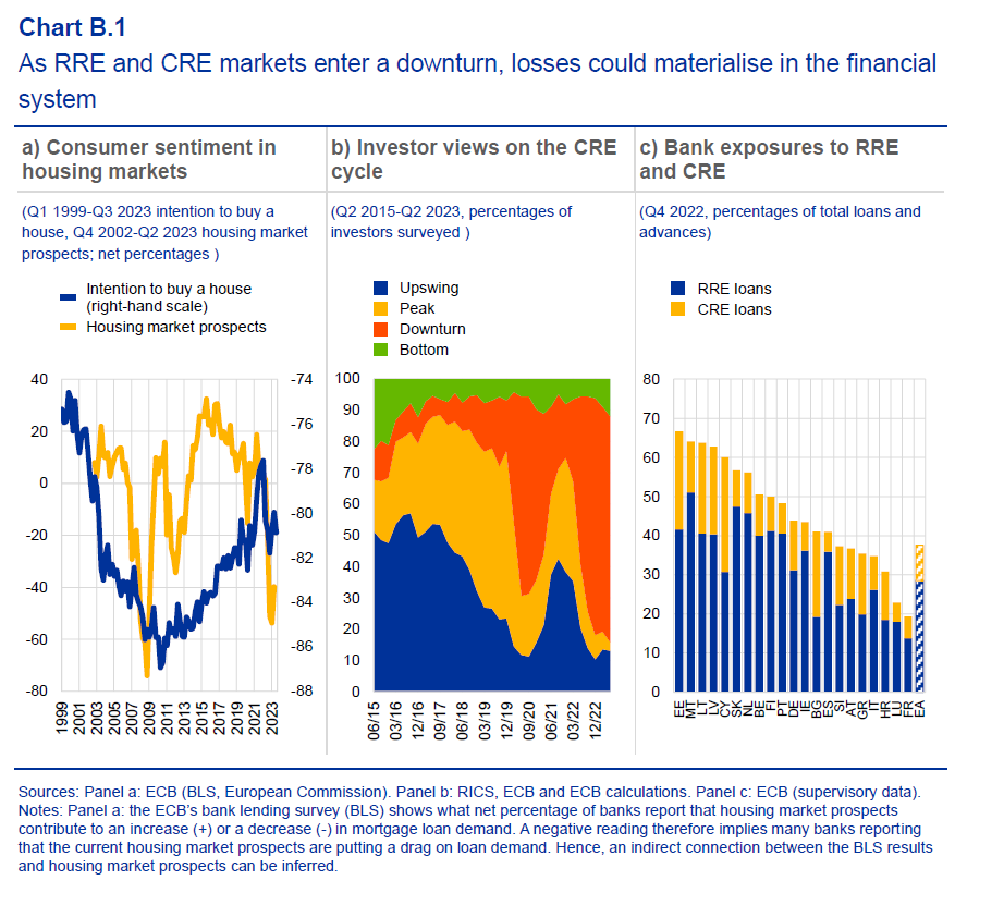 Come si può osservare, sia il mercato residenziale (residential real estate, RRE), che quello commerciale (commercial real estate, CRE) esibiscono prospettive poco incoraggianti. Notate che l’esposizione delle banche in tutta l’area, con l’eccezione di Cipro e dell’Irlanda, è largamente sbilanciata verso i mutui residenziali, ossia quelli per l’acquisto delle abitazioni. Parliamo quindi del debito in mano alle famiglie. Si tratta di un’esposizione assai più sistematicamente rilevante rispetto a quella del mercato commerciale, perché ovviamente più estesa.