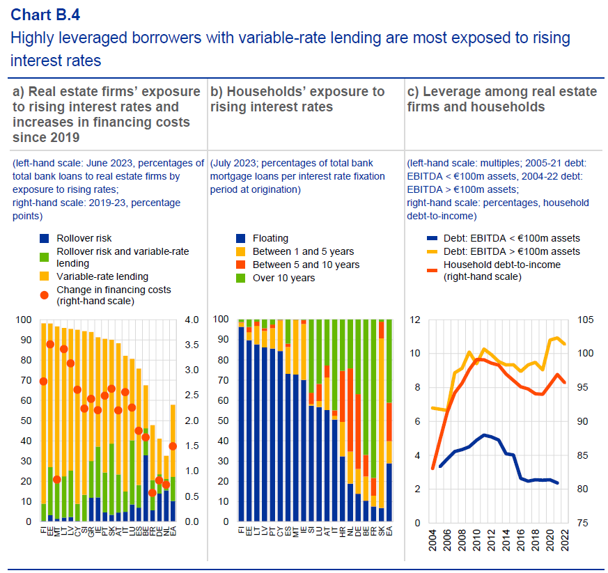 Come si può osservare dal grafico sopra, la situazione delle famiglie dell’area è molto eterogenea. Ci sono differenze nella quota di mutui fissi e variabili fra le famiglie dei vari paesi – notate quella fra Finlandia e Germania nel pannello di sinistra – così come la quantità di debito a breve termine che deve essere rinnovato. Avere un mutuo variabile e per giunta essere soggetti a roll over espone chiaramente di più al rialzo dei tassi. I calcoli della Bce, per far capire la differenza, mostrano che in Finlandia il costo medio di un finanziamento immobiliare, dal 2019, è aumentato del 2,75 per cento, a fronte dello 0.75 per cento tedesco. Mercati e consuetudini diverse, insomma, fanno costi (e rischi) molto diversi.
