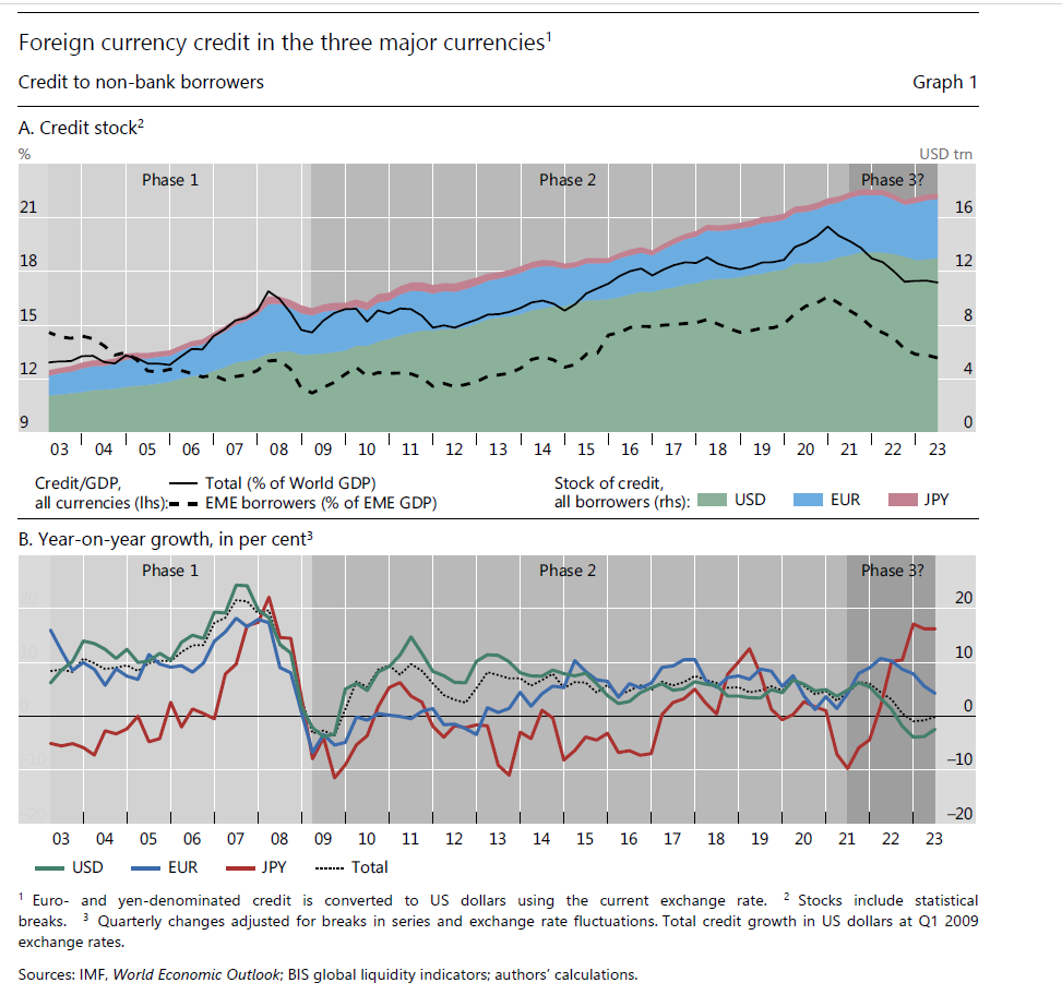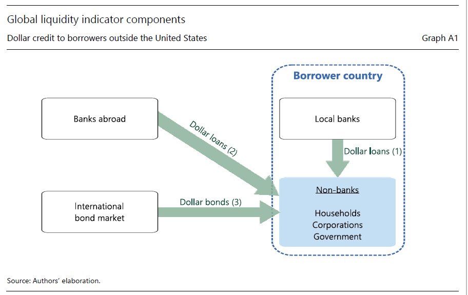 Il termine “liquidità globale” è un concetto che mette al centro dell’osservazione il credito in valuta estera, inteso come somma di prestiti bancari e prestiti derivanti dal mercato obbligazionario, che un certo paese utilizza in quantità di prenditore. E’ un modo, insomma, per osservare il debito estero in valuta per un certo paese, osservato nelle principali monete di riferimento e fonti di finanziamento. Il settore, che all’interno del paese, viene analizzato come prenditore è quello delle non-banche, ossia famiglie, imprese e governi, quindi il settore non finanziario. Il grafico sotto aiuterà a capire meglio.