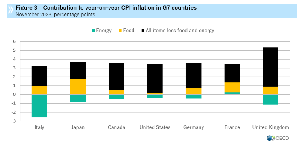 Complessivamente, per i paesi del G7, l’inflazione è passata dal 3,4% di ottobre al 3,1% di novembre. L’Italia si segnala per il rilevante impatto deflazionistico generato dall’energia, che quindi, guardandola da un altro punto rimane, rimane un nostro grande elemento di fragilità. In generale, tuttavia, rimane ancora rilevante il contagio che l’impennata inflazionistica ha avuto sull’intera struttura dei prezzi. La “coda” dei rincari, insomma, è ancora fin troppo lunga.