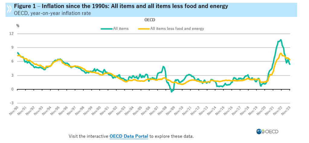 Gli ultimi dati sull’inflazione diffusi da Ocse raccontano di un graduale rallentamento dell’inflazione core (quindi senza cibi freschi ed energia) a cui si associa un calo più drastico dell’inflazione complessiva. Contengono quindi insieme una buona notizia e una meno buona.