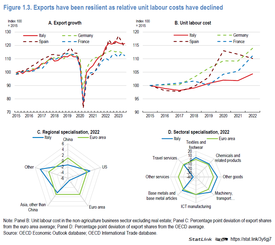 Le nostre esportazioni se la cavano ancora bene, per fortuna. Il nostro export ci ha tenuto a galla in questi anni difficili e ancora oggi non fa mancare il supporto. E’ anche grazie all’export che manteniamo una bilancia dei pagamenti stabile e possiamo permetterci certe pazzie fiscali e previdenziali. Quindi evviva l’export. Epperò. Mi sorge il sospetto che il miracolo dell’export italiano lo paghino gli italiani che lavorano nel settore esportatore, quando vedo che il costo unitario del lavoro è il più basso fra i nostri cugini europei di taglia assimilabile, che quindi hanno stipendi assai migliori dei nostri (e ci vuole poco). Non esportiamo solo ottima manifattura. Esportiamo anche salari bassi. Ma non ditelo là fuori.