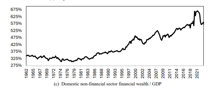 Il mondo di ieri, quando c’erano solo le banche che prestavano denaro e facevano circolare il credito, era anche quello in cui la ricchezza del settore non finanziario, ossia famiglie e imprese, cresceva più lentamente. Quando, a partire dagli anni ’70 le banche hanno iniziato a dedicare una quota decrescente del proprio bilancio ai prestiti a questo settore (grafico sopra pannello a), affidandosi a quella che più tardi verrà definita finanza “esotica” – ad esempio le cartolarizzazioni – la ricchezza del settore privato ha iniziato a cresce drammaticamente, mano a mano che le banche si “liberavano” dei prestiti all’economia e finanziavano quelli che altri soggetti – le cosiddette non-banche – facevano al loro posto.
