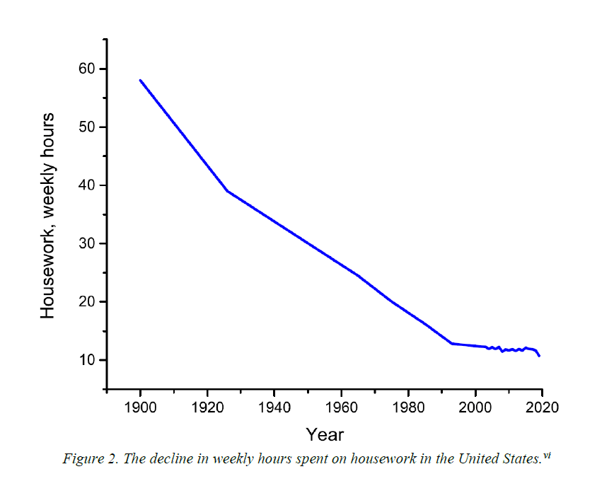 Il grafico sopra illustra magnificamente queste osservazioni. Cent’anni fa le famiglie americane spendevano – termine non scelto a caso – sessanta ore a settimana per i lavori domestici, otto e più ore al giorno. Nel 2020 si stima siano un quarto, quindi un paio d’ore. Giusto il tempo di caricare e scaricare i vari elettrodomestici che fanno il lavoro per noi.