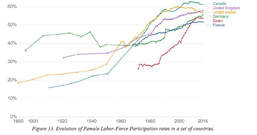 Ma non solo ovviamente. Le 45 ore di risparmio di tempo di lavoro domestico, che in larga parte venivano svolti dalle donne, si sono trasformati in tempo di lavoro retribuito, come mostra l’andamento dei tassi di partecipazione nel tempo.