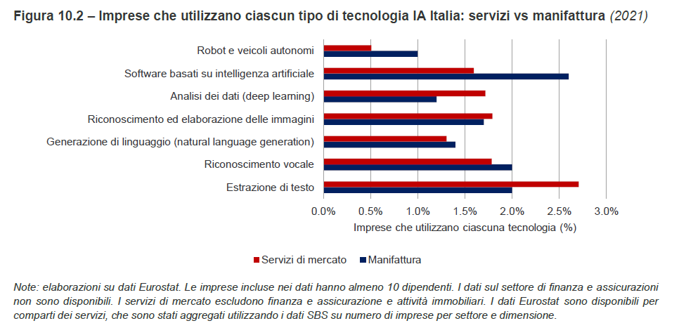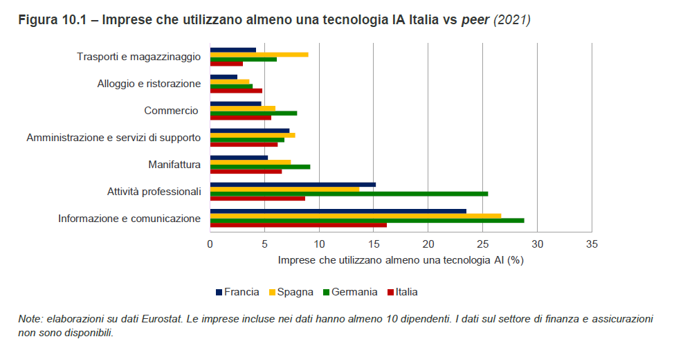 Come premessa giova ricordare che l’utilizzo di IA sembra essere più intenso nei settori ad alto valore aggiunto, confermandosi questa tecnologia una risorsa per la produttività, ma anche una possibile fonte di squilibri, se la si collega alla possibilità che vada ad erodere quote di lavoro qualificato.