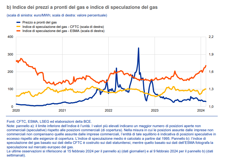 Nel merito tecnico, l’approfondimento proposto da Francoforte mostra che “negli ultimi anni gli indici di speculazione sul mercato del gas sono rimasti sostanzialmente stabili sia negli Stati Uniti sia in Europa”. Comportamento simile si è osservato, seppure con alcuni picchi, per il petrolio. Ma “nel complesso,