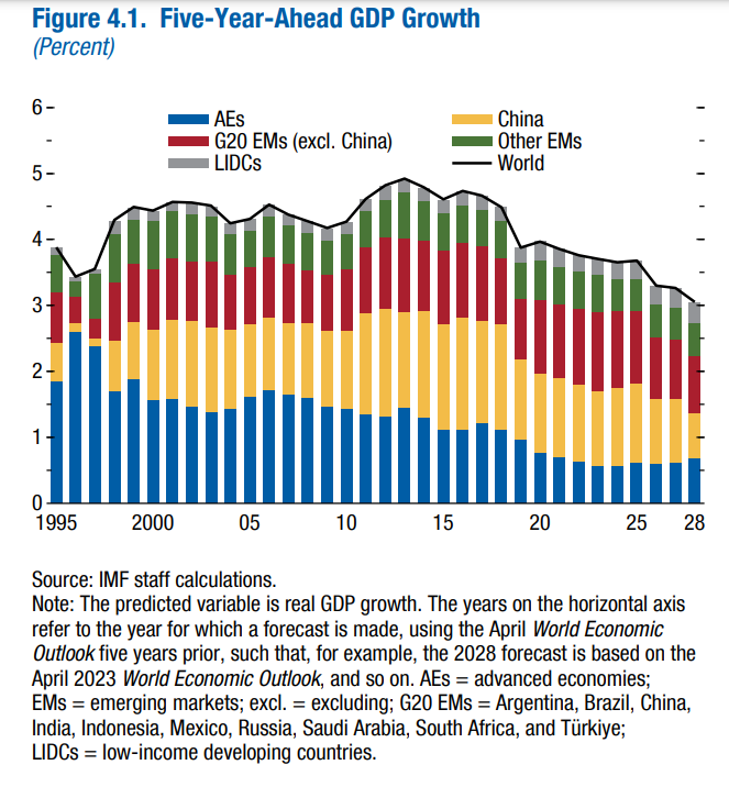 Contare sempre di più non vuol dire solo che la quota della crescita globale che arriva da questi paesi sarà sempre più rilevante, come peraltro si evince dai trend messi in luce dal Fmi. L’istogramma blu del grafico sotto, che rappresenta i paesi ad economia avanzata è più eloquente di mille ragionamenti.