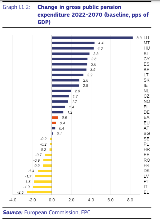 In Europa nel 2022 c’erano 28 persone 20-64enni a fronte di 10 over65. Nel 2045, il domani più vicino a noi, si stima ci saranno solo 19 20-64enni, e nel 2070, il nostro dopodomani, saranno ancora meno: solo 17. Questo scaricherà una notevole pensionistica sui bilanci dello stato che non verrà più coperta dai contributi. Non a caso questa voce di costo è quella che pesa più sui bilanci di previsione di spesa dei singoli paesi.