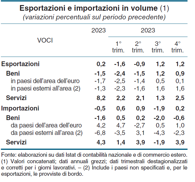 E’ sicuramente una buona notizia che anche l’ultimo trimestre del 2023, proseguendo il dato positivo del terzo, dopo che i primi due erano stati negativi, abbia visto il nostro export di beni in ripresa. Ma è una notizia ottima, e purtroppo non abbastanza osservata, che il nostro settore dei servizi abbia visto una crescita costante per tutto l’anno, totalizzando una crescita delle esportazioni dell’8,2% rispetto al 2022, a fronte di un aumento del 4,3% delle importazioni.
