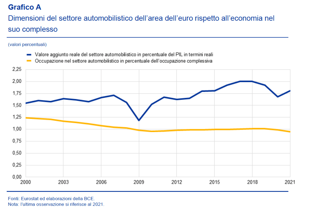 L’ultimo bollettino della Bce contiene una interessante analisi che ci consente di farci un’idea assai più chiara del peso specifico del settore automobilistico nell’economia europea, premessa fondamentale per qualunque tipo di ragionamento.