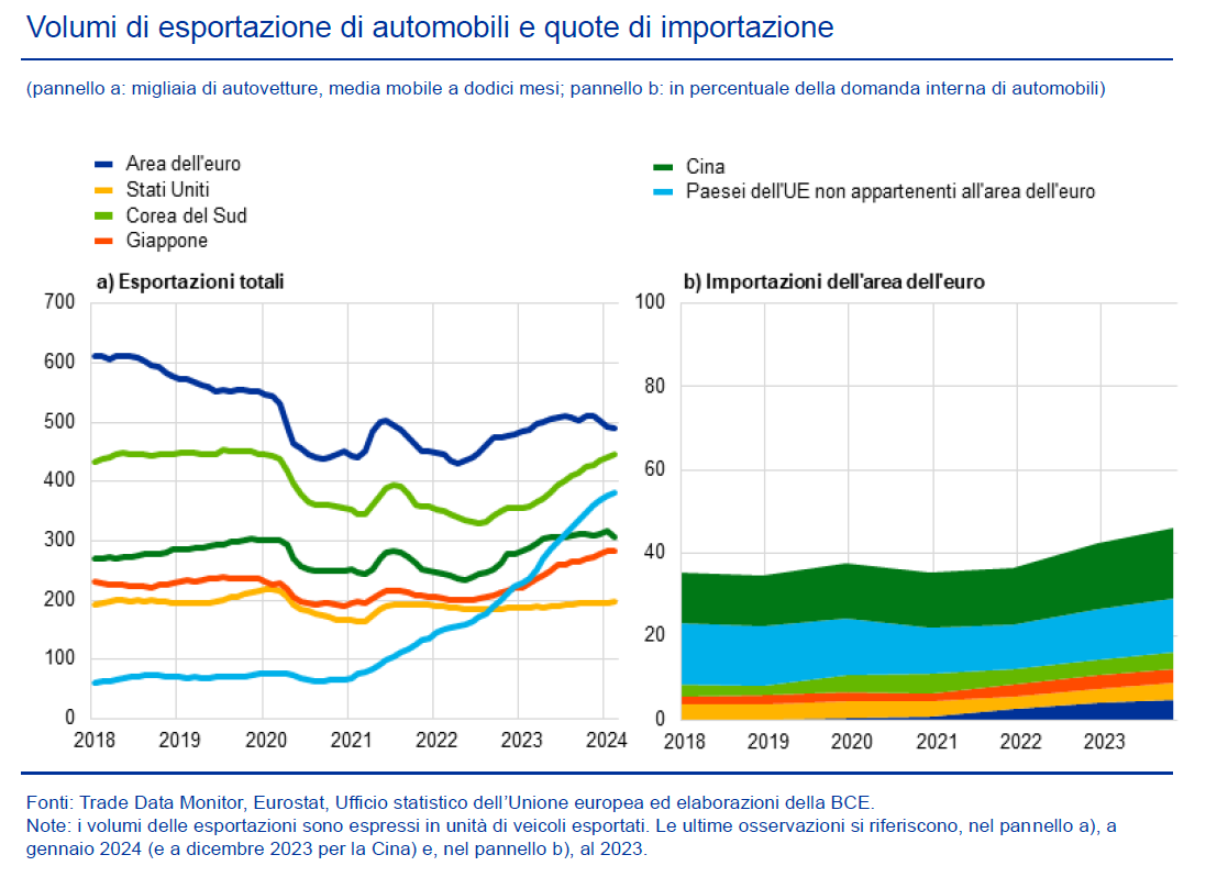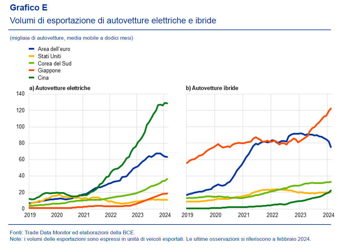 Complessivamente il settore auto europeo ha retto, compensando con le vendite di elettriche ed ibride il calo delle vendite nelle motorizzazioni tradizionali. La Cina ha guadagnato quote di mercato sull’elettrico, ma per lo più su piccole auto, e alla fine dei conti l’Eurozona rimane il secondo maggiore produttore di auto elettriche e ibride, con una notoria vocazione verso i modelli di fascia alta.