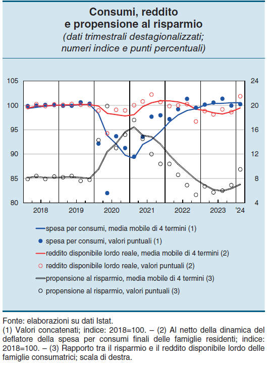 Sia come sia, il risultato è che nel primo trimestre del 2024 la spesa delle famiglie per consumi è cresciuta dello 0,3% rispetto all’ultimo quarto 2024, quando invece era diminuita dell’1,4%, e Bankitalia, che discute di questi andamenti nel suo ultimo bollettino economico, stima che questa ripresina sia proseguita anche nel secondo trimestre, sul quale però non ci sono ancora dati disponibili.