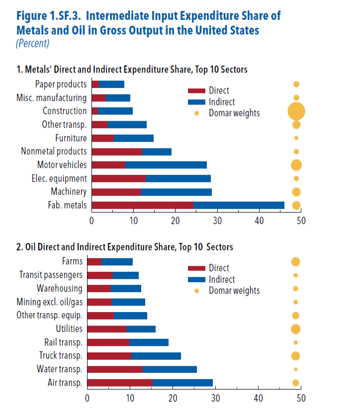 I metalli critici, e il rame in un mondo elettrico è sicuramente il primo della lista, hanno una crescente rilevanza economica nel mondo di oggi. Possiamo farcene un’idea osservando quando pesino il petrolio e poi i metalli in alcune produzioni di base negli Stati Uniti, secondo quanto riporta il Fmi.