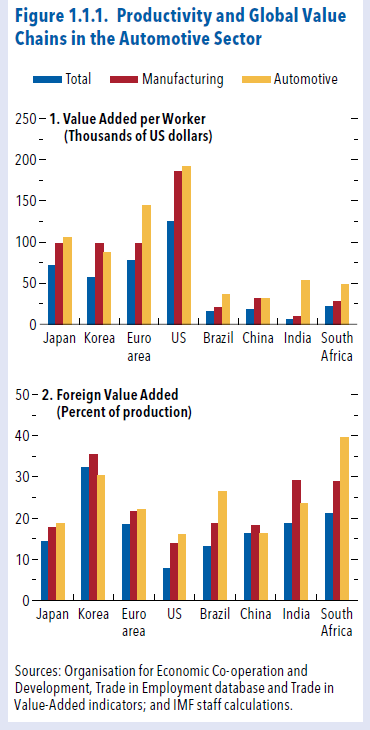 Un paio di pagine contenute nell’ultimo World Outlook del Fmi ci consentono agevolmente di comprendere perché ormai l’automotive non sia più solo un problema economico (ammesso che sia stato solo questo in precedenza) ma una questione complessa che ha profonde ricadute che il grafico che apre questo post ci consente di intuire molto rapidamente.