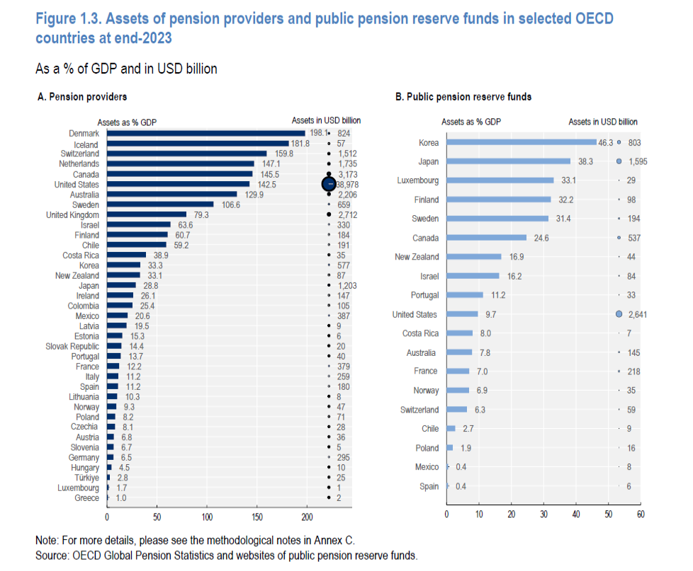 Il trend di lungo periodo, e questa è sicuramente una informazione rilevante, rimane in crescita, malgrado le varie crisi che dal 2008 in poi hanno messo a repentaglio il mondo finanziario. Gli asset, sempre nei paesi Ocse, sono più che triplicati, passando dai 28,8 trilioni del 2003 ai 63,1 trilioni del 2023. Un risultato ottenuto in parte grazie ai risultati ottenuti dagli investimenti, in parte grazie alle politiche governative che hanno mutato le regole d’ingaggio della previdenza spingendo la gente a rimanere di più al lavoro o promuovendo la previdenza complementare.