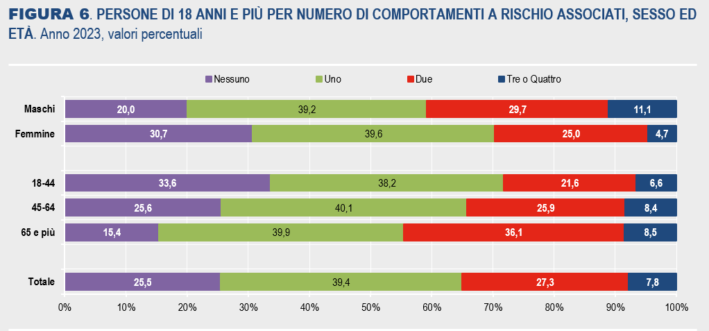 Il punto saliente e che i quattro comportamenti a rischio individuati da Istat fanno sistema fra loro. E’ più probabile aumentare di peso se si consuma alcol e si fa una vita sedentaria, e spesso chi consuma alcol lo fa fumando una sigaretta, magari accompagnando il tutto con cibo fortemente calorico. Quindi non stupisce che molti soggetti associno due o più di questi comportamenti.