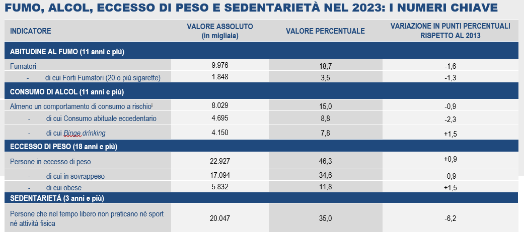 Qui osserviamo rapidamente come i nostri connazionali si rapportino con questi comportamenti a rischio: fumo, alcol, sovrappeso e sedentarietà. Quanto a questi ultimi due, l’Italia sta meglio di altri paesi, ma non sfugge al destino di ipernutrizione, che spesso rima con depressione, dell’Occidente. Quasi la metà della popolazione è sovrappeso, molti sono obesi, e la quota dei minori in questa condizione è allarmante. Almeno per chi ha capito che un minore sovrappeso sarà quasi sicuramente un adulto nella stessa condizione a rischio di molte patologie.