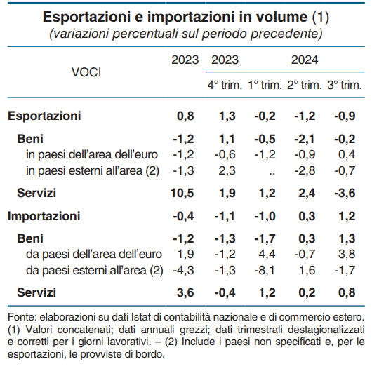I dati riportati non hanno bisogno di molti commenti. Nel corso dei mesi estivi la domanda estera netta ha contribuito negativamente al pil, in conseguenza del fatto che le importazioni sono risultate maggiori delle esportazioni, sia per i beni che per i servizi. E questo a sua volta dipende dal fatto che le famiglie, nel terzo trimestre, hanno irrobustito i loro consumi, che di per sé ha effetti espansivi sul pil, salvo che per il fatto che questo effetto si compensa perché molta di questa domanda genera importazioni.