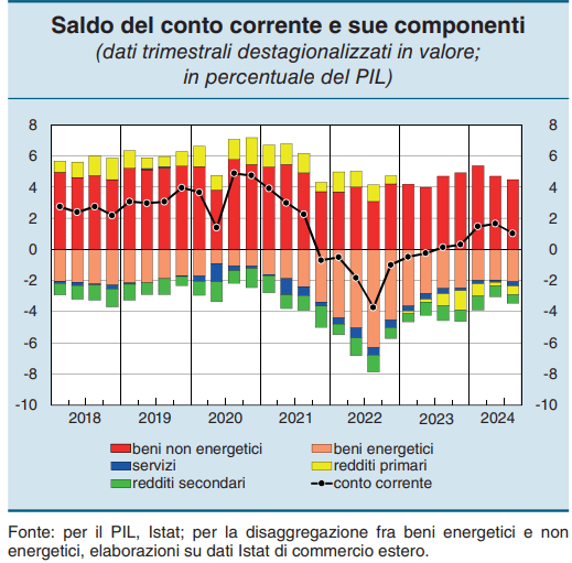 Ricapitolando: l’Italia ha il problema che non riesce ad esprimere una domanda forte abbastanza da compensare gli effetti negativi che tale domanda genera sugli scambi commerciali, che al momento sono l’unica cosa che tengono in piedi il nostro saldo corrente della bilancia dei pagamenti, che infatti tende a ridursi.