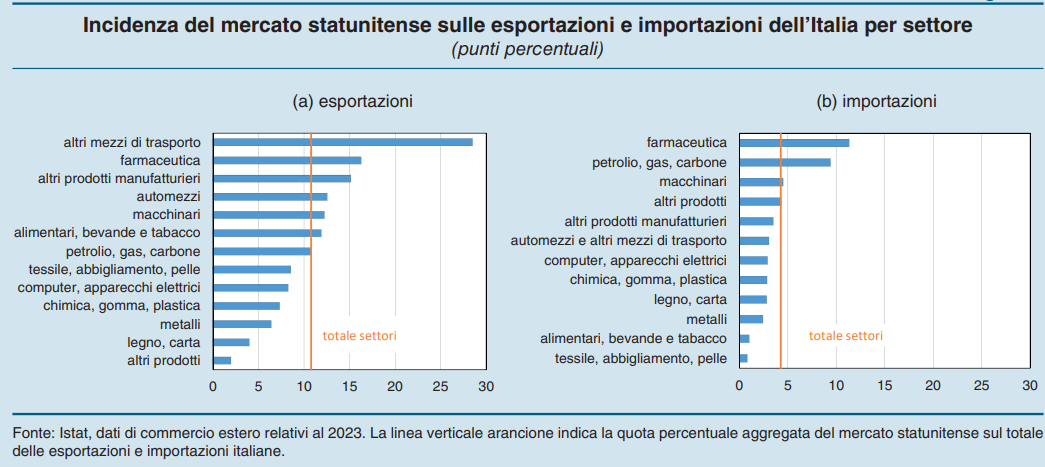 Complessivamente, “gli Stati Uniti costituiscono un mercato di destinazione per quasi un terzo delle aziende esportatrici italiane. Poco più della metà delle vendite verso questo paese è realizzata da grandi imprese (con almeno 250 addetti), con un’esposizione media pari al 5 per cento del fatturato e al 15 per cento delle proprie esportazioni. Per le imprese piccole e medie il mercato americano risulta relativamente più rilevante (in media, circa il 7 per cento del fatturato e il 27 per cento delle esportazioni). A questa classe dimensionale appartiene inoltre la quasi totalità degli esportatori caratterizzati da un’esposizione particolarmente elevata verso gli Stati Uniti”.