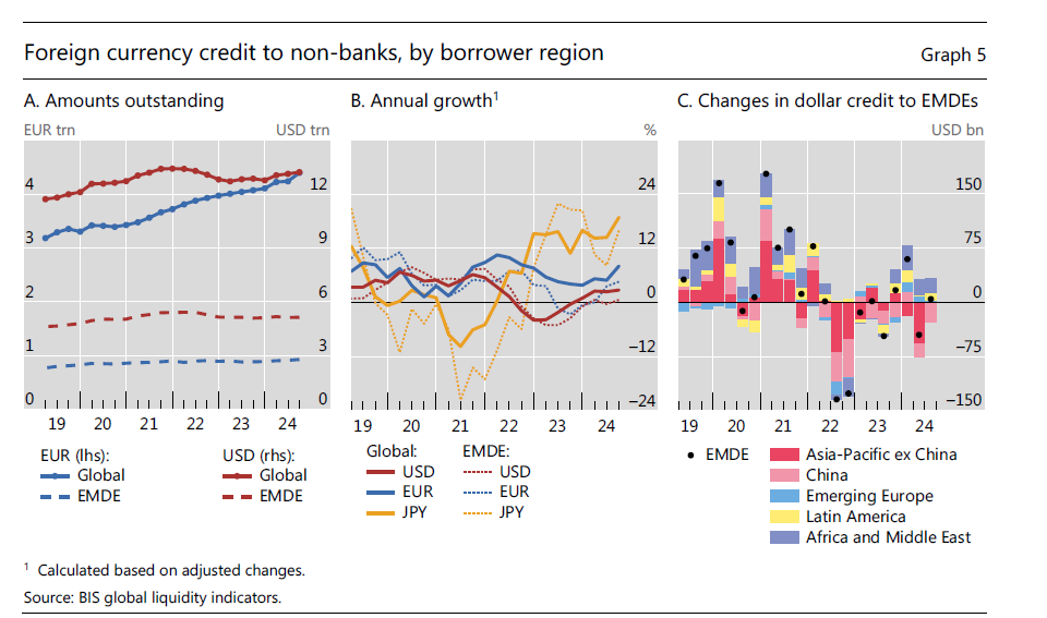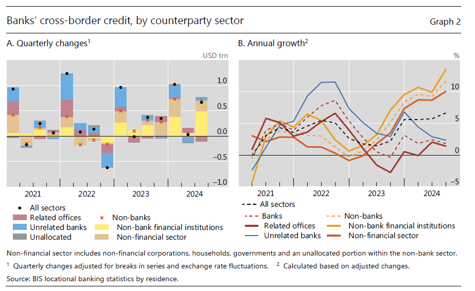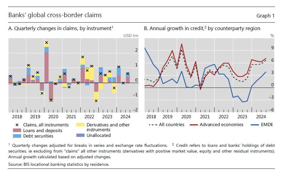 Le ultime statistiche sulle liquidità internazionale diffuse dalla Bis di Basilea, relative al terzo trimestre dl 2024, confermano che il credito transfrontaliero, di origine bancaria e non bancaria, gode ancora di ottima salute. Le fibrillazioni che già in quei mesi agitavano il commercio internazionale, del quale – giova ricordarlo – spesso i flussi finanziari sono semplici controparti, sembrano per il momento non influire sugli scambi di denaro.