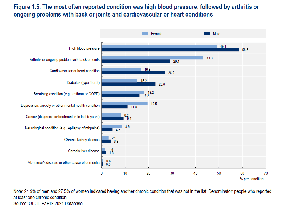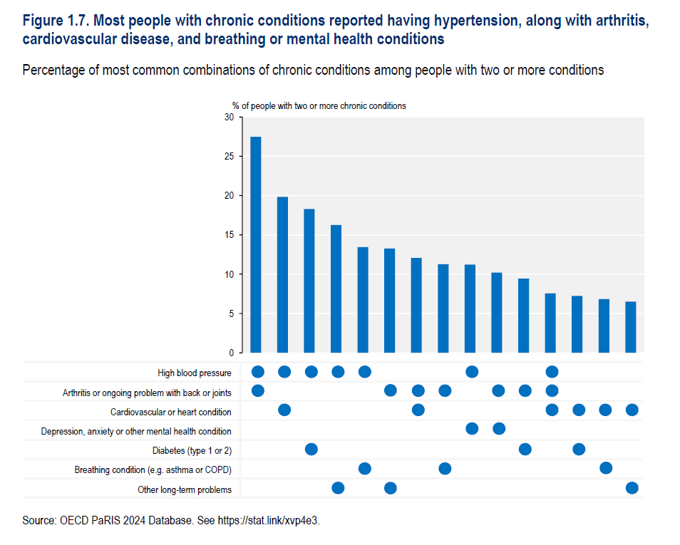A proposito di polimorbilità, Ocse nota che alcune malattie sono statisticamente maggiormente associate. Ad esempio ipertensione e artrite, che si combinano per il 27% della popolazione. Oppure ipertensione problemi cardiovascolari, che riguardano il 20%, o diabete e ipertensione, il 18. Notate che si tratta di disturbi che spesso sono strettamente collegati all’alimentazione o alla mancanza di attività fisica.