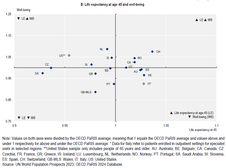 Se avete un po’ di tempo, impiegatelo a dare un’occhiata a questo interessante grafico che difficilmente troverete altrove, a meno che non siate appassionati frequentatori dei rapporti Ocse sullo stato di salute, letteralmente, della nostre popolazioni. Ve lo semplifico. I paesi a sinistra hanno un’aspettativa di vita, all’età di 45 anni, inferiore della media dell’area. Mentre le due parti superiori, nei due differenti grafici, espongono quei paesi dove il livello di salute e di benessere è superiore alla media. Se guardiamo in casa nostra nostra, osserviamo che viviamo più a lungo della media, ma in condizioni di salute peggiori e con un livello inferiore di benessere. Potremmo stare meglio meglio, insomma. Magari imparando ad invecchiare.