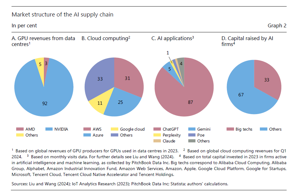 Se saliamo ancora di livello, e guardiamo ai modelli di intelligenza artificiale (foundation model), il mercato è assai più popolato. Sono stati censiti 300 modelli forniti da 14 diverse aziende, e poi ci sono modelli alternativi costruiti da aziende che hanno realizzato versioni proprietarie, come OpenAI e Google DeepMind. Altri, come Facebook, si sono orientati su modelli aperti – Meta, con Llama e la cinese DeepSeek – ma in ogni caso il mercato appare chiaramente dominato da pochi soggetti. Nel 2023 ChatGpt pesava il 69% nel mercato dell’IA generativa, in termini di ricavi. Può essere un risultato molto precario, viste le caratteristiche di questo mercato. Ma intanto è un fatto che conferma la vocazione dei mercato IA, a tutti i livelli, alla concentrazione.