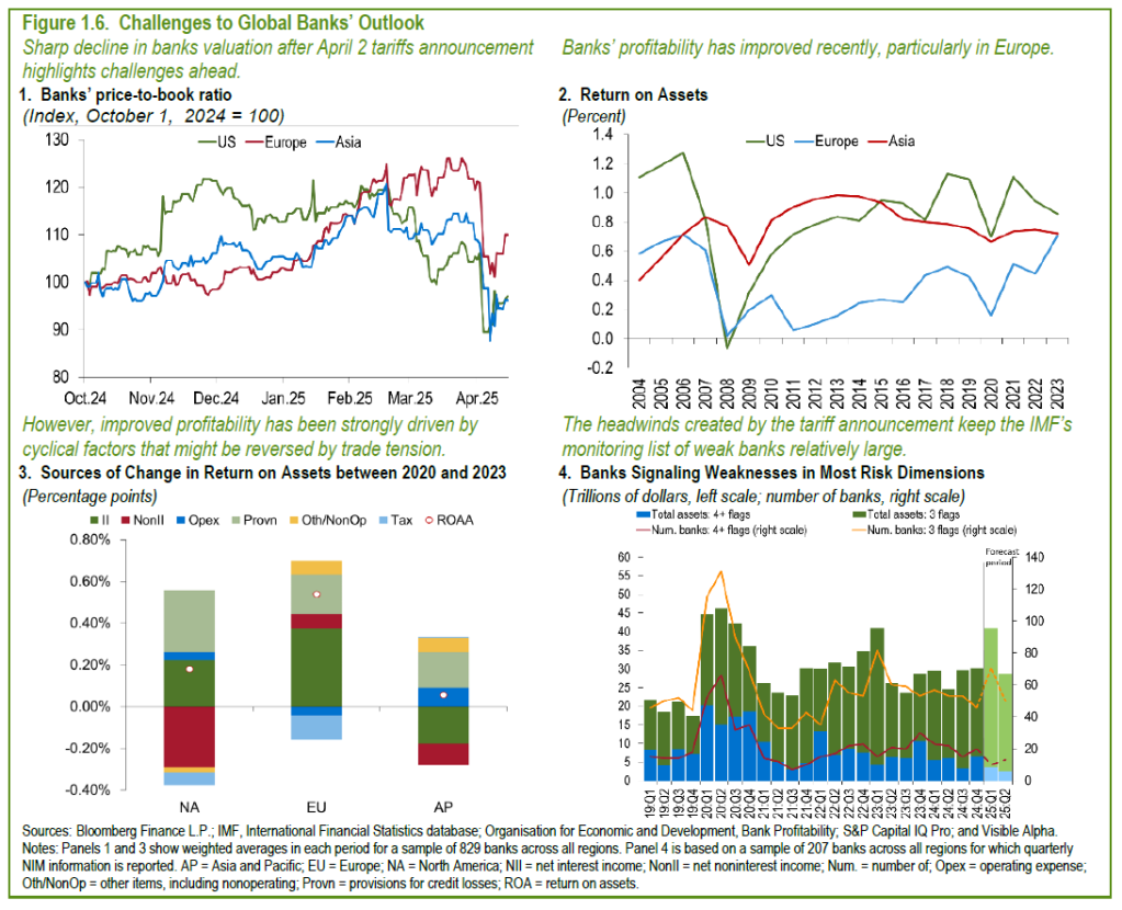 Fin qui il Fondo. Si può aggiungere come pro memoria, che il sistema bancario internazionale può essere danneggiato per molte altre ragioni dall’aumento delle tariffe. Basta vedere, nel grafico che apre questo post, come hanno reagito le quotazioni bancarie dopo il “liberation day” del 2 aprile. E’ chiaro a tutti, quali siano i rischi. Ma evidentemente non abbastanza.