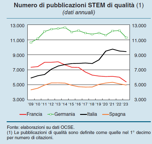 Sulle pubblicazioni STEM, il grafico sotto ci comunica che siamo cresciuti molto e abbiamo superato i nostri principali paesi europei assimilabili.
