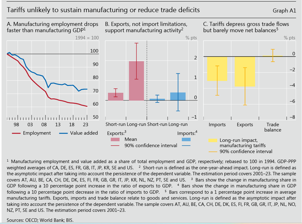 Secondo luogo comune, uno dei più perniciosi. Non è vero che il deficit commerciale fa diminuire l’occupazione nella manifattura. Ossia uno degli argomenti fondati del populismo contemporaneo. E’ vero infatti che il settore manifatturiero esprime oggi una quota minore sull’occupazione nelle economie avanzate, ma la stessa quota, in relazione al pil, è diminuita assai meno (grafico in alto a sinistra). “Questo indica che parte del declino dei posti di lavoro manifatturieri è stato determinato dalla sostituzione tra capitale e lavoro, riflettendo una crescente automazione piuttosto che il commercio internazionale”, spiega la Bis. E’ assai più probabile che siano le esportazioni stagnanti, piuttosto che le importazioni crescenti, a determinare la debolezza del settore manifatturiero.