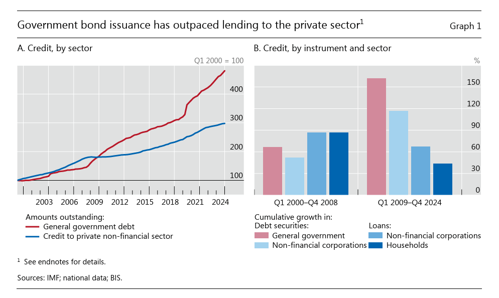 Il fatto storico, e non è esagerato scomodare la storia, che finora è passato praticamente inosservato è che da tre lustri a questa parte il settore pubblico ha superato quello privato nell’emissione di bond. Questo vuol dire, in pratica, che i governi hanno assorbito molto più credito dei privati.