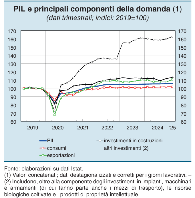 Il boom degli investimenti in costruzioni, alimentato dai fondi del PNRR contrasta notevolmente con la linea piatta del pil, che oscilla svogliatamente fra i 100 e i 110 punti di indice, con base 100 riferita al 2019. Significa in pratica che abbiamo recuperato il livello pre Covid, ma fatichiamo ad andare molto oltre, pur considerando una minima ripresa di consumi e investimenti, con l’export a far sostanzialmente da traino. Perché gli investimenti in costruzioni, malgrado siano cresciuti nell’ordine del 60 per cento rispetto al 2019 servono a poco, nel conto generale del Pil. E questo per la semplice ragione che la spinta di valore aggiunto che offrono all’economia è molto inferiore rispetto a quella di altri settori. Con le costruzioni puoi ricostruire i monumenti o i ponti. Ma non certo un’economia frizzante.