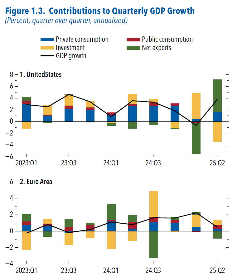 Ma se questa strategia vale per gli investitori sui mercati, non può funzionale per i governi che sono alle prese con una difficile ricomposizione dei loro bilanci. E devono farlo scontando una incertezza ancora notevole che trova nel commercio – il livello delle tariffe medio internazionale rimane al 19% – il suo principale attivatore. Per comprendere meglio la questione, può essere utile osservare le componenti del pil negli ultimi trimestri delle principali aree economiche.