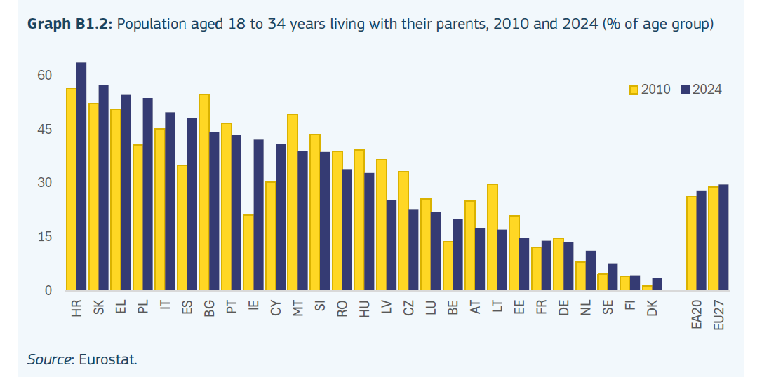 L’Ue la spiega in termini puramente economici: “I giovani incontrano maggiori difficoltà rispetto alla media della popolazione nel mercato immobiliare, e questo riflette sia l’evoluzione del mercato del lavoro, con una maggiore probabilità di disoccupazione tra i giovani, sia l’aumento dei prezzi delle case. I giovani adulti tendono ad avere maggiori difficoltà a ottenere un mutuo a causa della mancanza